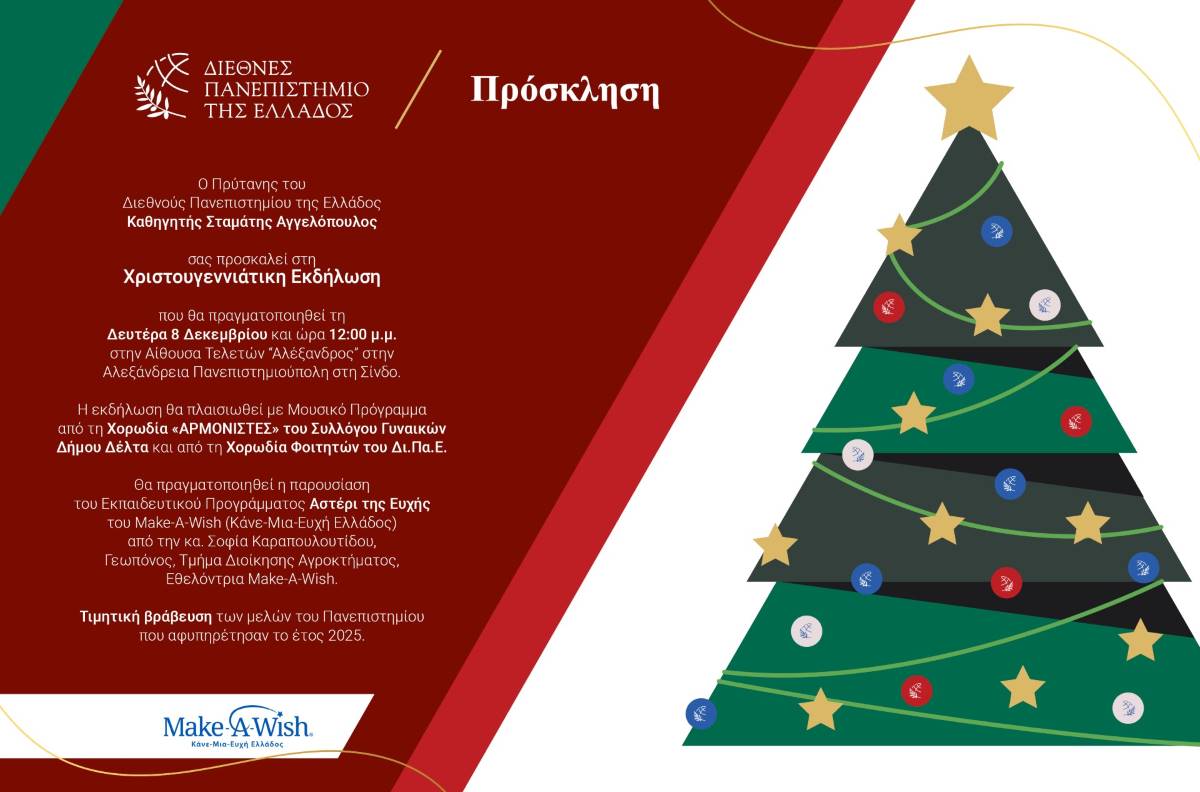 Ο Πρύτανης του Διεθνούς Πανεπιστημίου της Ελλάδος, Καθηγητής Σταμάτης Αγγελόπουλος, σας προσκαλεί στη Χριστουγεννιάτικη Εκδήλωση που θα πραγματοποιηθεί τη Δευτέρα 8 Δεκεμβρίου 2025 και ώρα 12:00 μ.μ., στην Αίθουσα Τελετών “Αλέξανδρος”, στην Αλεξάνδρεια Πανεπιστημιούπολη στη Σίνδο.